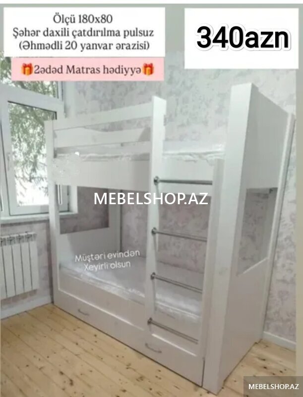 350 Aznİkimərtəbəli çarpayı Sifarişlə hazırlanır Rəng seçimi var Ölçü 80/180sm Matraslar hədiyyə Qiymət 340azn Şəhərdaxili çatdırılma pulsuz